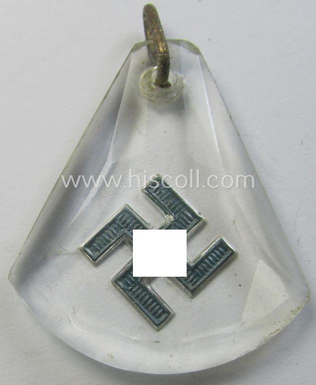 This is an unusual - and with certainty not that often seen! - (polished) glass-based so-called: female-related, patriotic swastika-hanger (ie. 'Anhänger') or: 'N.S.D.A.P.-supportive piece being an example that comes in an overall nice- (albeit clearly worn- ie. used-), condition. The pear-shaped piece shows an 'inlay' comprising of light-blue-toned swastika and has an approximate height of: 3,8 cms. (and width of 3,3 cms.) and is totally void of any makers'-designation (as can be seen on the pictures). It originated from a private-household in Germany where it was recently found amongst other TR-related insignia and jewellery. Simply an attractive, patriotic-styled N.S.D.A.P.-related piece that presumably dates from the thirties and that can be easily described as an example of typical 'Nazi-Kitsch'!