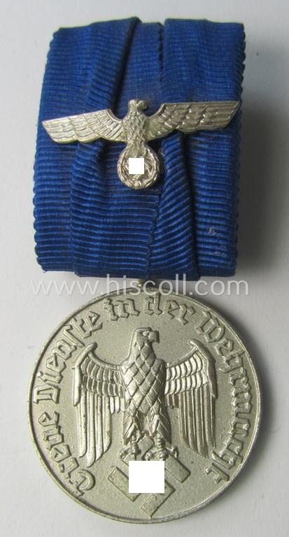 Attractive, silver-toned & detachable WH (Heeres o. KM) so-called: 'Einzelspange' showing a: 'WH-Dienstauszeichnung 4. Stufe' (as was intended for 4 years of loyal-service) and that shows a detailed, Heeres o. KM-type-eagle-device, period-attache...