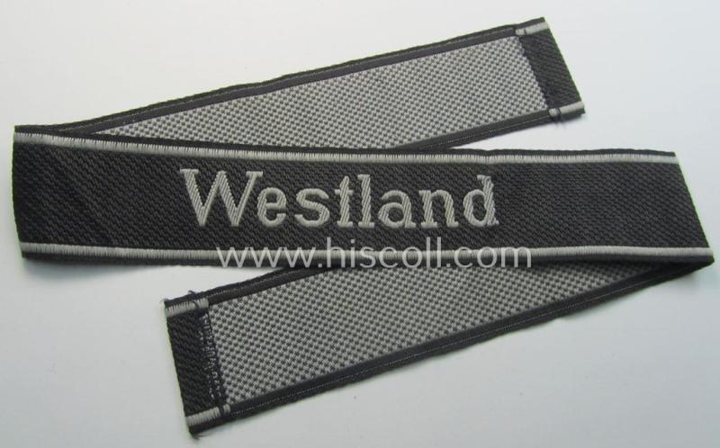 Waffen-SS, 1943/44 pattern cuff-title (ie. 'Ärmelstreifen') depicting the machine-woven Latin script text in silver-grey linnen as was intended for a member of the: 'SS-Regiment "Westland" (ie. part of the: '5. SS-Pz-Gren.-Div. "Wiking")