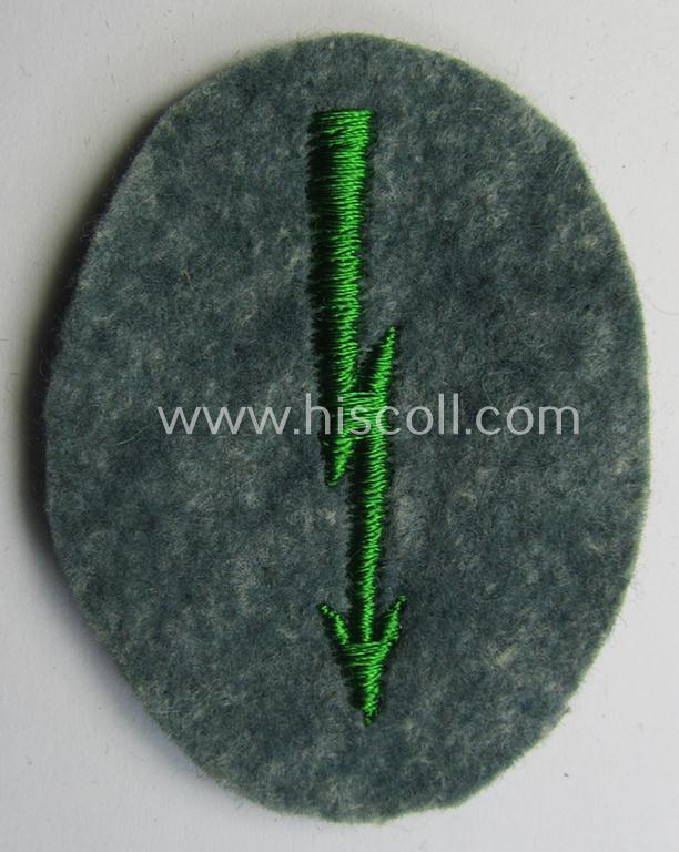This is an attractive example of a so-called: police- (ie. 'Schutzpolizei o. Gendarmerie'-) related, neatly machine-embroidered trade- ie. special-career patch (ie. 'Laufbahn- o. Tätigkeitsabzeichen') depicting a bright-green-coloured 'signal-blitz' (ie. downward-pointed arrow) as was specifically intended for a signal-staff-member (ie. 'Nachrichtenpersonal') and that comes in an overall very nice- (and I deem hardly- ie. simply never used- nor worn-), condition. The patch is neatly machine-embroidered in bright-green-coloured linnen on a field-grey- (ie. typical police) coloured- and/or woolen-based background. The patch - which is not 'backed' as more often encountered - hardly shows wear nor age and comes in a wonderful condition, overall. Simply a neat - and actually quite scarcely encountered! - police- (ie. 'Schutzpolizei o. Gendarmerie'-) related trade- and/or special-career patch!
