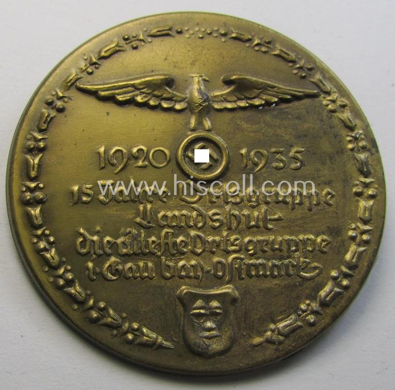 Commemorative, bright-golden-toned 'N.S.D.A.P.'-related 'tinnie' depicting an N.S.D.A.P.-party-eagle and surrounded by the text: '15 Jahre Ortsgruppe Landshut - die älteste Ortsgruppe i. Gau bay. Ostmark - 1920 -1935'