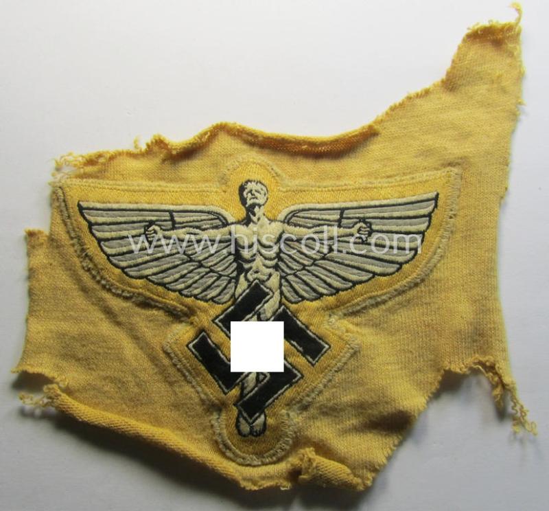 This is an attractive - and most cerainly very unusually encountered! - bright-yellow-coloured so-called: N.S.F.K.- (or: 'National Socialistisches Flieger Korps') sports-shirt breast-eagle (ie. 'N.S.F.K.-Brustadler für das Sporthemd') being a nicely 'BeVo'-woven- (and carefully 'cut-out'!) example depicting the: 'Fliegender Mensch'-symbol that comes (pre)mounted onto its piece of bright-yellow-coloured linnen and that comes still mounted onto its piece of a period (and equally bright-yellow-toned) sport-shirt. The larger-sized breast-eagle ie. sports-shirt-badge has an approximate wingspan of 12,5 cms. - and is neatly woven in the so-called: 'BeVo'-like weave-technique - and comes (off-factory) mounted on its bright-yellow-coloured- and/oralso linnen-based (as can be seen on the pictures). The piece was most certainly used ie. once-shirt-attached and just shows some minimal age, wear and/or staining: it is, however, very nicely preserved (as can be seen on the pictures). This patch originates from the USA where it was stored for decades as a so-called: 'veteran bring-back'-item. Simply a very attractive - and truly unusually found! - example that was specifically intended for usage onto the bright-yellow-coloured: 'N.S.F.K.-Sporthemden': one the first such neat item I ever had on offer!
