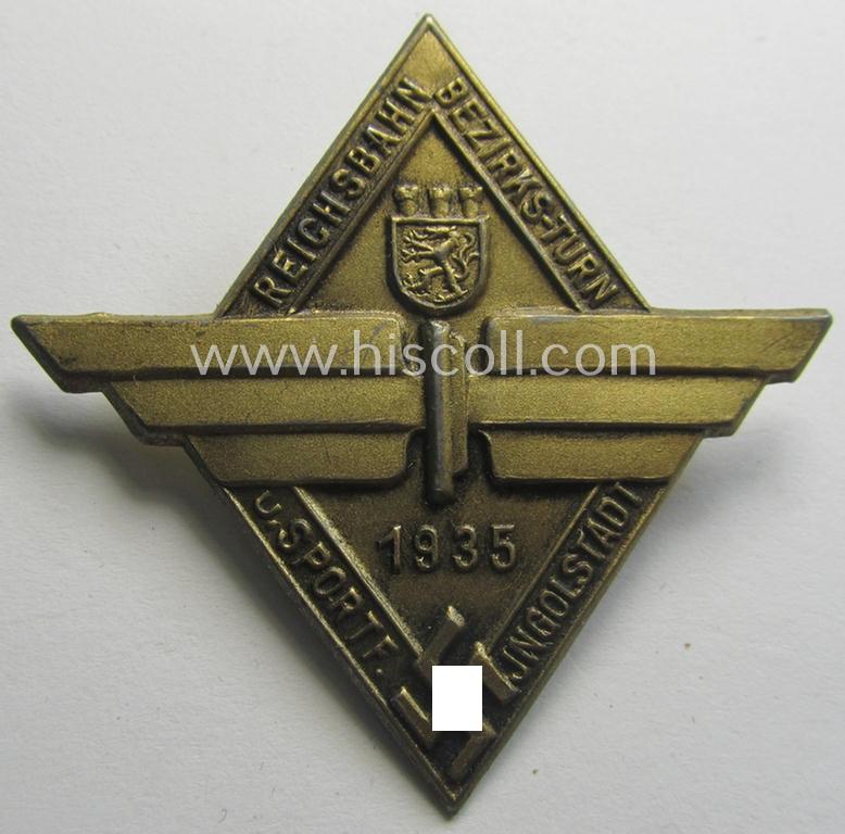 Commemorative - and unusually seen! - bright-golden-toned 'Reichsbahn'- (ie. DRB-) related 'tinnie' depicting a DRB-device, swastika and provinical-shield and surrounded by the text: 'Reichsbahn Bezirks-Turn- u. Sportf. - Ingolstadt - 1935'