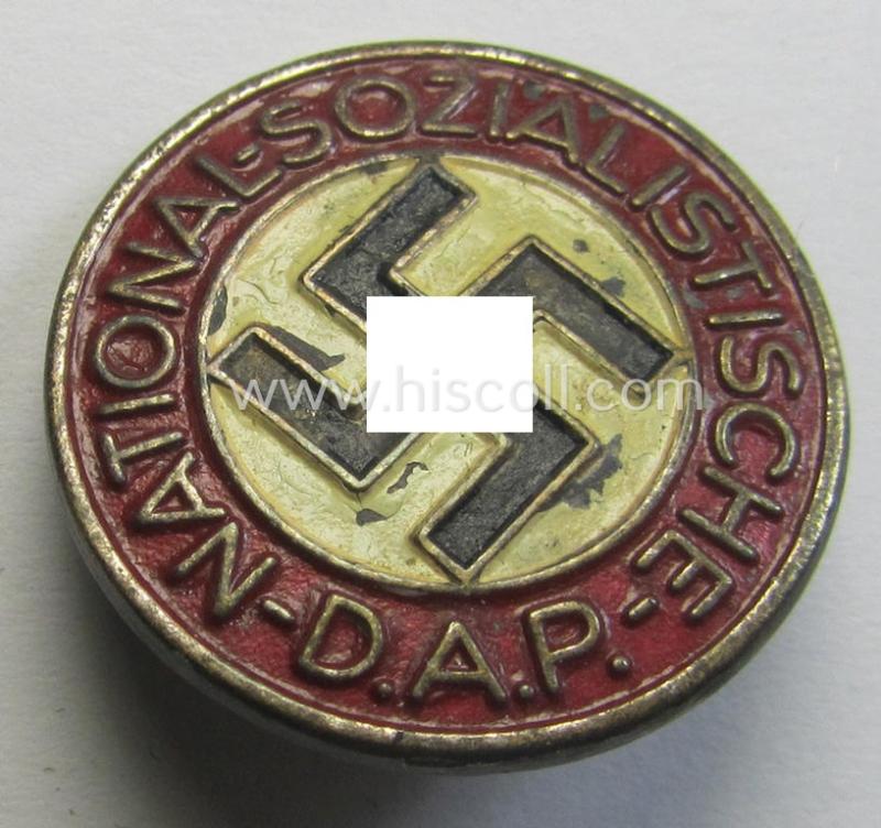 Neat, non-enamelled (ie. painted/sprayed) red-coloured- and/or 'variant'-pattern 'N.S.D.A.P.' membership-pin- ie. party-badge (or: 'Parteiabzeichen') which is nicely maker-marked on the back with the makers'-designation: 'RzM' and/or: 'M1/6...