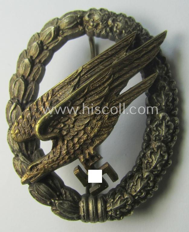 Stunning - and I deem fairly early-war-period! - WH (Luftwaffe) 'Fallschirmschützen-Abzeichen' (or: paratroopers-badge) being a maker- (ie. 'Imme & Sohn'-) marked- and/or: typical 'Tombak'- (ie. 'Buntmetall'-) based example