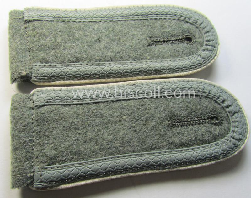 This is a truly very attractive - and/or fully matching! - pair of 'standard-issue'-pattern, WH (Heeres) early- (ie. mid-) war-period- (ie. 'M40- o. M43'-) pattern NCO-type shoulderstraps (ie. 'Schulterklappen für Unteroffiziere des Heeres') as piped in the white- (ie. 'weisser'-) coloured branchcolour as was intended for - and clearly worn by! - an: 'Unteroffizier eines Infanterie-Regiments' (or: NCO ie. junior-sergeant who served within an infantry-regiment ie. unit) and that comes in an overall very nice- (ie. clearly used- ie. worn- and/or tunic-removed-), condition. The straps - which are both approximately 11 cms. sized in length - have the 'standard-pattern'- and/or: field-grey-coloured, woolen-based 'upperdecks' and have as stated above the desirable 'silk-like'-type- and/or white- (ie. 'weisser'-) coloured branchcolour ie. piping attached (as can be seen on the pictures). The shoulderstraps show the ('standard'-issue-pattern) bluish-grey-coloured (and neatly 'sub-dued'!) NCO-braid attached denoting that the pair was intended for an NCO holding the rank of: 'Unteroffizier'. The pair - that shows some obvious albeit minimal wear - comes mounted onto its original tongues and does just show some moderate age and/or staining (as can be seen on the pictures). Simply a very attractive early- (ie. mid-) war-period, 'Heeres' NCO-type, 'Infanterie'-related shoulderstrap-pair that belonged to an: 'Unteroffizier eines Infanterie-Regiments': I deem that I have priced this very attractive - and by all means 'text-book'! - pair accordingly!