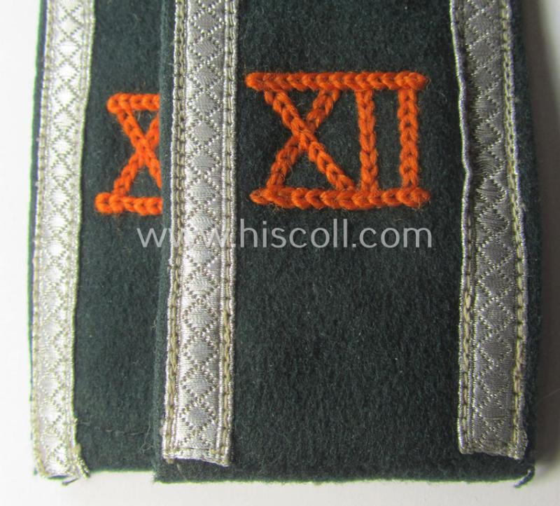 This is a truly very attractive - fully matching and actually quite rarely encountered! - pair of early- (ie. pre-war-) period- (ie. 'M36 o. M40'-pattern- and/or pointed-styled), WH (Heeres) 'cyphered' NCO-type shoulderstraps being of the generic-model without having any piping as was intended for - and most certainly worn by! - an: 'Unteroffizier des Wehrersatzdienstelle im Wehrkreises XII' (or: army-NCO ie. junior-sergeant who was part of the recruitment-troops within the area of 'Wehrkreis XII', being a larger area situated in various provinces and having its headquarters situated in the town of Wiesbaden) and that comes in an overall very nice- (albeit issued ie. moderately worn-), condition. The neat shoulderstraps - which do show some regular age ie. wear and/or minimal staining caused by moderate usage and/or wear - come as stated above in an overall very nice, albeit moderately used and/or worn condition but are void of any damage whatsoever. The straps are executed in the darker-green coloured- (and/or: smooth-type wool) and have of course no piping attached (they are of the generic, pointed- ie. 'M36 o. M40'-pattern). The shoulderstraps - which come mounted onto their functional tongues attached - measure approximately 11,7 cms. in length each. The straps show the neat Roman-styled- and neat machine-embroidered (Roman-styled) 'XII'-numerals (ie. 'Ziffern') which are executed in bright-orange- ie. 'orangeroter'-coloured so-called: 'Kurbelstickerei' as to be expected, denoting the NCOs rank ie. function of: 'Unteroffizier des Wehrersatzdienstelle im Wehrkreises XII'. The straps show the standard-type, silverish-grey-coloured NCO-braid attached denoting the NCOs rank of: 'Unteroffizier'. I deem that I have priced this very attractive 'Unteroffizier des Wehrersatzdienstelle im Wehrkreises XII'-shoulderstrap-pair according to its evident desirability and/or comparative rarity!