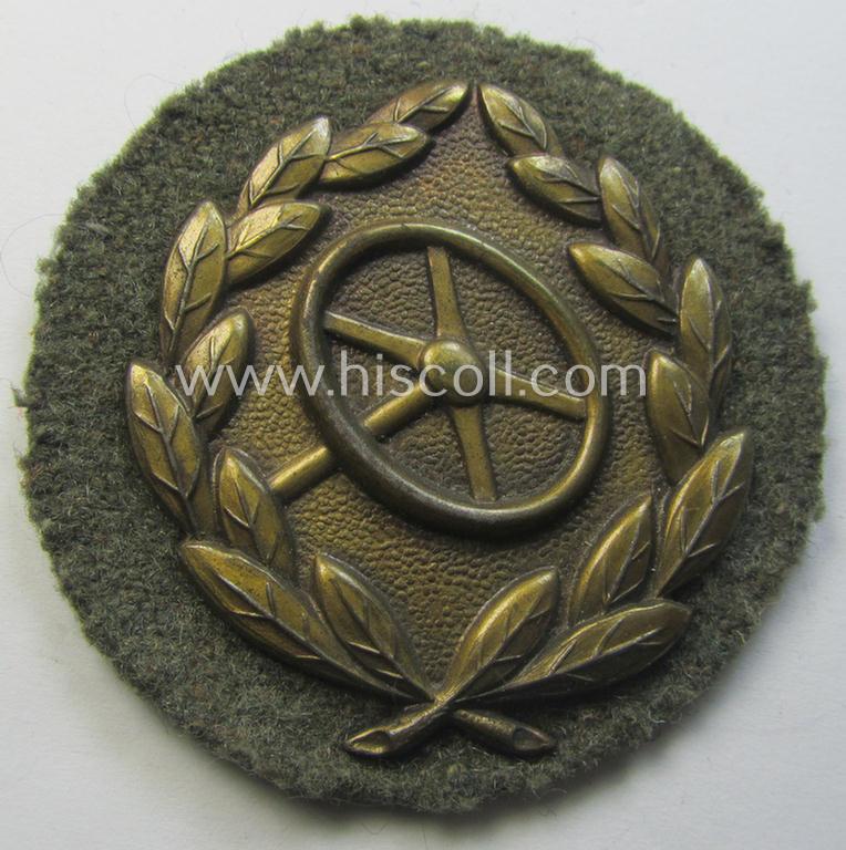 The attractive - and most certainly very detailed! - WH (Heeres o. Waffen-SS) so-called: 'Kraftfahrbewährungs-Abzeichen in Bronze' (or: bronze-class drivers'-proficiency-badge) comes in an overall very nicely preserved condition: it was never cleaned and truly retains most (ie all!) of its somewhat shiny, golden-bronze-toned surface (as can be seen on the pictures). As stated above, was this nicely pronounced badge clearly issued and/or worn: it retains both its prongs (and back-plate and most of its beige-toned 'backing-paper') and came mounted onto a piece of field-grey-coloured wool: it was most certainly worn as such. The piece was never before part of a collection: it was recently found at a German private household who used- and after that stored this piece for decades. Simply an attractive - and truly used- and worn! - example of a WH (Heeres o. Waffen-SS) so-called: 'Kraftfahrbewährungs-Abzeichen in Bronze'!