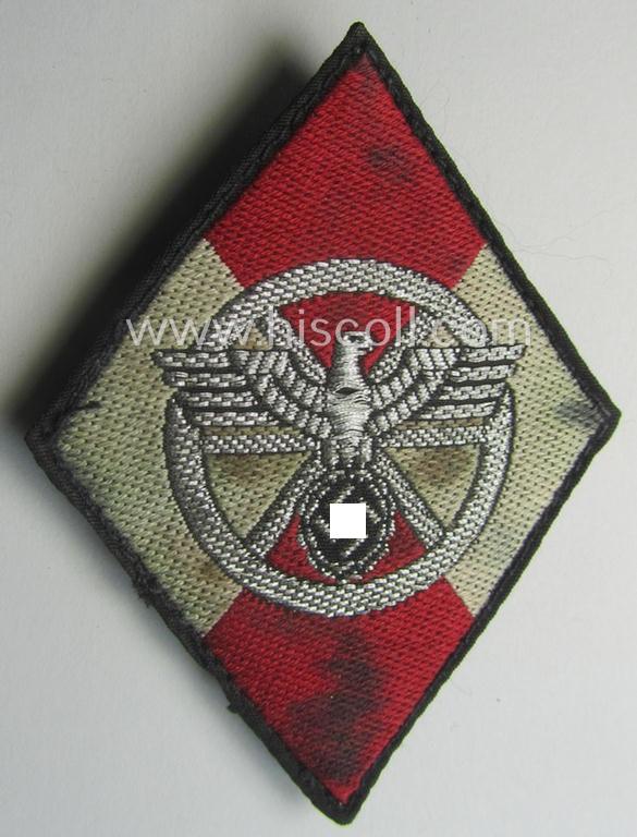 This is a very attractive - and I deem clearly worn- ie. once tunic-attched and with certainty fairly scarcely encountered! - example of a (period) pre-folded- and neatly 'padded', so-called: Motor-HJ- (ie. 'Hitlerjugend') ie. N.S.K.K.- (or: 'National Socialistisches Kraftfahr Korps'): 'Motor-HJ Raute des 2. Modell' (being a 'diamond'-shaped arm-badge of the second and/or final pattern ie. '2. Modell') that comes in an overall very nice- (and I deem issued- and/or moderately used- and/or worn-), condition. The badge- that is void of its I deem once-present 'RzM-etiket' - is neatly executed in machine-woven, silver-coloured 'braid' (being of the so-called: 'flat-wire'-pattern) on a bright-red- and/or white-coloured- and/or (typical) silk- (ie. 'BeVo'-like-) linnen-based background. The badge - that shows some obvious wear, age and/or staining - was carefully pre-folded and just shows some moderate age, wear and/or staining. These patches were worn by HJ-members that were destined to be enlisted into the N.S.K.K.- (or: 'National Socialistisches Kraftfahr Korps'). Simply an attractive Motor-HJ- (ie. N.S.K.K.-) related trade- ie. specialist-badge (ie. 'HJ-Tätigungsabzeichen') that is with certainty not that often offered for sale and that is I deem accordingly priced!
