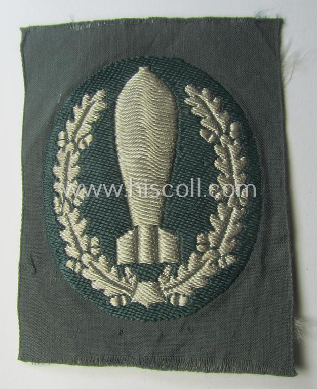 This is a truly very attractive - and actually extremely rarely encountered! - 'BeVo'-woven version of a WH (Heeres) so-called: trade- and/or special-career arm-insignia (or: 'Laufbahn- o. Tätigkeitsabzeichen') as was specifically intended for a: 'Nebelwerfer Richtkannonier' (or: qualified smoke-troops canon-operator) and that comes in an overall very nice- (ie. 'virtually mint- ie. unissued'- and/or never tunic-attached-), condition. This rarely observed badge was an army special-career insignia that was specifically intended for a: 'Nebelwerfer Richtkannonier' (or: qualified smoke-troops canon-operator). The patch on offer here is neatly woven in the so-called 'BeVo'-weave pattern (done in silverish-white-coloured linnen on a darker-green-coloured- and/or: also linnen-based background) and comes as stated above in an overall very nice (and I deem never used- ie. 'virtually mint-/unissued'- and/or never tunic-attached- nor folded-) condition (as can be seen on the pictures). The patch shows some minor staining simply caused by decades of storage only. As far as I know are there only a handfull of these rare insiginia known to date. Simply a truly very attractive and rarely encountered: 'Laufbahn- o. Tätigkeitsabzeichen' that was intended for usage by a: 'Nebelwerfer Richtkannonier'!