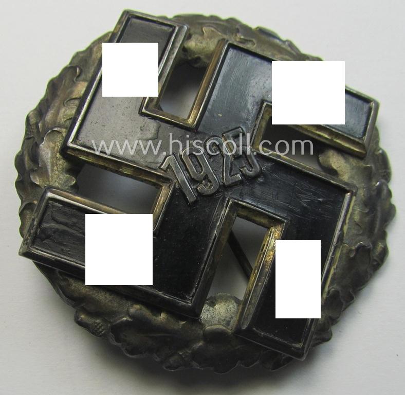 This is a truly attractive - and with certainly very rarely encountered! - example of a so-called: 'Allgemeines N.S.D.AP.-Gau-Ehrenzeichen für die Mitgliedschaft seit 1925' (or: 'General N.S.D.A.P. Gau Honorbadge, commemorating membership since the year: 1925') being a genuine silver- (ie. '800'-silver-content marked!) example that shows a clearly present and superimposed makers'-designation on its back (that reads: 'Wächtler & Lange - Mittweida') and that comes in an overall very nicely preserved- and/or only moderately used- ie. worn, condition. The piece shows a (fully preserved) black-coloured (ie. painted or sprayed) swastika within its centre the years-designation: '1925': it comes mounted onto a circular-shaped, oak-leave wreath and shows two (nicely preserved and totally unaltered!) hollow-type rivets as to be expected (as can be noticed on the pictures). The piece on offer here was just moderately worn and does show some minimal age ie. tarnish. The N.S.D.A.P.-party was geographically organised into various districts. Below the national- (ie. 'Reichs'-) level there were various 'Gau'-districts (which were the administrative equivalent of traditional German states). The leadership of each 'Gau' was authorised to award special badges to recognize a variety of achievements in the political realm. The exact requirements for each award were determined by the leader of each 'Gau' and could range from 'outstanding service to the local political organisation', to: 'long service to the N.S.D.A.P.-party' or: 'participation in important historic events during the partys struggle before 1933'. Some of these 'Gau-Ehrenzeichen' were issued in several grades to recognize different levels of experience or achievement. These badges were worn on military and/or civilian uniforms and were a mark of honor for the political-elite. Twelve different of these 'Gau-Ehrenzeichen' (or: 'Gau Honor Badges') were designed for the 33 (later 43) 'Gau'-districts within Germany. They were carefully designed with impressive designs to denote the high levels of achievement for which they were awarded and the quality of these badges is generally extremely high. These 'Gau-Ehrenzeichen' were awarded in limited numbers and as a result NONE of these existing 'Gau-Ehrenzeichen' are commonly encountered today. Simply a very attractive - and with certainty very desirable! - example of a: 'Allgemeines N.S.D.AP.-Gau-Ehrenzeichen für die Mitgliedschaft seit 1925' that is I deem accordingly priced!