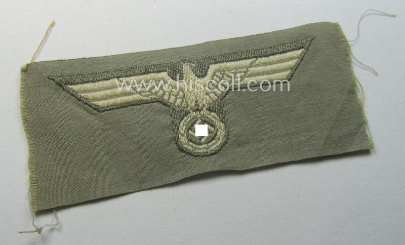 This is an attractive example of a WH (Heeres) - very early- ie. pre-war-period! - white-coloured side-cap-eagle (ie. 'Schiffchenadler für Mannschaften u. Unteroffiziere des Heeres') as was executed in the neat 'BeVo'-weave pattern on a typical greyish- (ie. bluish-green-) coloured background and that comes in an overall very nice- (ie. never used- nor worn ie. 'virtually mint ie. unissued'-), condition. The eagle is executed in white-coloured linnen on a greyish- (ie. bluish-green-) coloured (and also linnen-based-) background and saw usage directly after the 'Reichswehr'-period (I deem around in the years 1935/36). It should be noted that especially these early-type side-cap-eagles are nowadays not that easily encountered: something that merits my asking-price. The piece on offer here comes in an overall very nice- (ie. never confectioned- nor side-cap-attached-) condition and comes as 'straightly cut-of the role' (as can be seen on the pictures). The piece - which is executed in the so-called: 'BeVo'-weave-pattern as to be expected - shows some minimal storage-age ie. staining simply caused by decades of storage only and can naturally easily serve to restore any early-pattern 'Heeres Schiffchen'. Simply a nice occasion to acquire an early-pattern WH side-cap-eagle for a competitive price!
