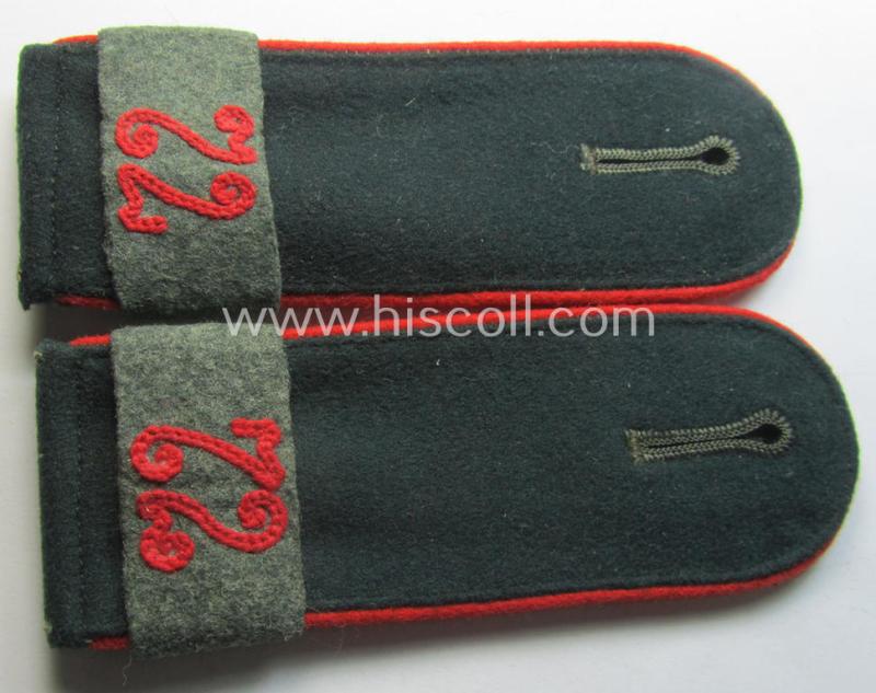 This is an attractive - fully matching and (I deem) just moderately used - pair of early- (ie. pre-)war-period and/or rounded-styled, WH (Heeres) so-called: 'M36- o. 'M40-styled', enlisted-mens'-type shoulderstraps as was piped in the neat bright-red- (ie. 'hochroter'-) coloured branchcolour and having a pair of (regular-styled) so-called: 'Schulterstück-Überschuben' period-attached as was intended for a: 'Soldat des Artillerie-Regiments 72' (or: simple soldier who served within the artillery-regiment, numbered: '72') and that comes in an overall very nice- (ie. I deem just minimally used- ie. worn-), condition. The straps - which are approximately 13 cms. sized in length each - have the 'standard-pattern'- and/or typical, darker-green-coloured and/or woolen-based 'upperdecks' and show the neat bright-red- (ie. 'hochroter'-) coloured and/or: woolen-type branchcolour (ie. piping) attached (as can be seen on the pictures). The straps - which are of the 'standard-issued'- ie. non-private-production - show some minimal staining simply caused by minimal wear and/or decades of storage. Of additional interest is, moreover, the fact that this pair came with a (fully matching) pair of (field-grey-coloured- and/or woolen-based) so-called: shoulderstrap-slip-ons (ie. 'Schulterstück-Überschuben') period-attached bearing both the unit-designation: '72' (as executed in equally bright-red-coloured, so-called: 'Kurbelstickerei' done in wool as can be seen on the pictures). Simply a nice occasion to acquire an attractive - and fully 'text-book'! - 'M36- o. 'M40-styled', enlisted-mens'-type shoulderstrap-pair as was intended for usage by a: 'Soldat des Artillerie-Regiments 72': great to complete any early- or: pre-war 'Heeres'-tunic!