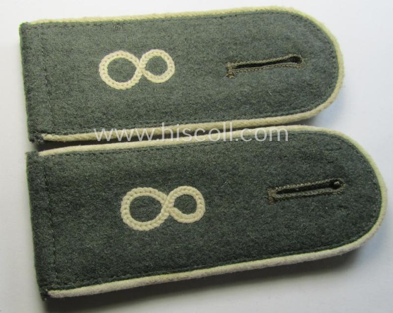 This is an attractive - fully matching and actually truly rarely encountered! - pair of (I deem) very early-period (ie. 'Reichswehr'-era), WH (Heeres) 'cyphered' enlisted-mens'-type shoulderstraps having the neat white- (ie. 'weisser'-) coloured and/or 'woolen'-type piping attached as was executed in neat field-grey-coloured- and/or: typically structured wool as was specifically intended for - and with certainty used by! - a: 'Soldat des Infanterie-Regiments 8' (or: simple soldier who served within the infantry-regiment numbered: '8') and that comes in an overall very nice- (albeit just moderately used ie. worn-), condition. The straps - which measure 11,5 cms. in length each - are fully 'text-book' in all facets and are executed in (typical 'Reichwehr'-era pattern!) wool and having the white- (ie. 'weisser'-) coloured and/or 'woolen'-type piping attached. The straps come mounted onto their functional, tongues attached: moreover, do they show the white-coloured '8'-cyphers (ie. numerals or: 'Ziffern') which are executed in so-called: 'Kurbelstickerei' as to be expected (as can be seen on the pictures). These type of (early) shoulderstraps are of the fairly early-war-period pattern straps and were worn in the period around 1935/1937. The pair only shows moderate wear and/or age and is just nicely preserved over the years (as can be seen on the pictures). Simply an attractive - and with certainty quite rarely encountered! - 'cyphered' shoulderstrap-pair that belonged to a: 'Soldat des Infanterie-Regiments 8' and that is (I deem) accordingly priced!