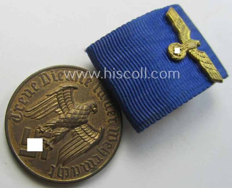 This is an attractive - and I deem just moderately used- and/or worn! - example of a minimally tarnished, golden-toned WH (Heeres o. Kriegsmarine) so-called: 'Einzelspange' (or: single-pieced medal-bar of the detachable pattern) showing a detailed: 'WH-Dienstauszeichnung 3. Stufe' (as was intended for 12 years of loyal-service) and that has a neat and pronounced (regular-sized) WH (Heeres o. Kriegsmarine) eagle-device period-attached and that comes mounted onto its confectioned, darker-blue- (ie. cornflower-blue-) coloured ribbon-bar as issued and/or worn. The detail on this example - which is of the desirable 'detachable pattern'! - is simply extraordinary: it has - I deem - never been cleaned nor polished and has an attractive and as stated above a just minimally tarnished) age-patina. The medal comes 'mounted' onto a metal-based clasp that is not 'backed' (and having a functional pin/catch-set-up) as was intended for wearing this example on a 'going-out'- ie. dress-tunic or 'Waffenrock'. This example truly retains gorgeous details and has a great age-patina: it retains most of its somewhat 'matted'- and/or: golden-toned finish without showing any defaults. The blue-coloured ribbon shows only minimal usage and/or staining. Simply an attractive WH (Heeres o. Kriegsmarine) example that comes mounted as a detachable: 'Einzelspange'!