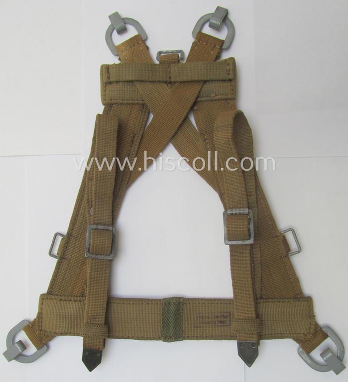 This is a truly attractive - hardly used and with certainty fairly scarcely seen! - I deem early- (ie. mid-war-) period- and 'all-linnen'-based, specific 'tropical-issue'-pattern, WH 'A-Rahmen' (ie. 'Gefechts- or 'Sturmgepäck' aka 'A-frame') that comes in a fully complete and/or totally untouched, condition. The frame comes naturally complete with all its linnen-based lashes, metal-based loops and tan-coloured linnen-based straps present and in place. The frame - which was recently found at a private-household in Germany - is of the specific 'tropical'-pattern which saw usage within the 'Afrikakorps' (but saw further usage throughout the war). The 'pack' is naturally fully functional and complete and does show a (surely present but impossible to decypher) makers'-designation- ie. date-stamp: this might, however, been 'washed-away' during moderate usage and/or wear (as can be seen on the pictures). The 'pack' is only minimally used and does show some minimal (rust)staining but is totally void of any damage or alike. Both its (blank) metal-based rivets are original to the frame and are not re-mounted-, re-rivited or alike). This example was surely issued and/or used, and can - I deem - be graded as a truly DAK- (ie. 'Afrikakorps'-) related item. All metal parts still retain (most of) their greyish-toned (ie.anodized) finish but do show some minimal staining. Simply an attractive - and nowadays scarcely seen! - piece of 'tropical'-issued WH-equipment that is I deem accordingly priced!