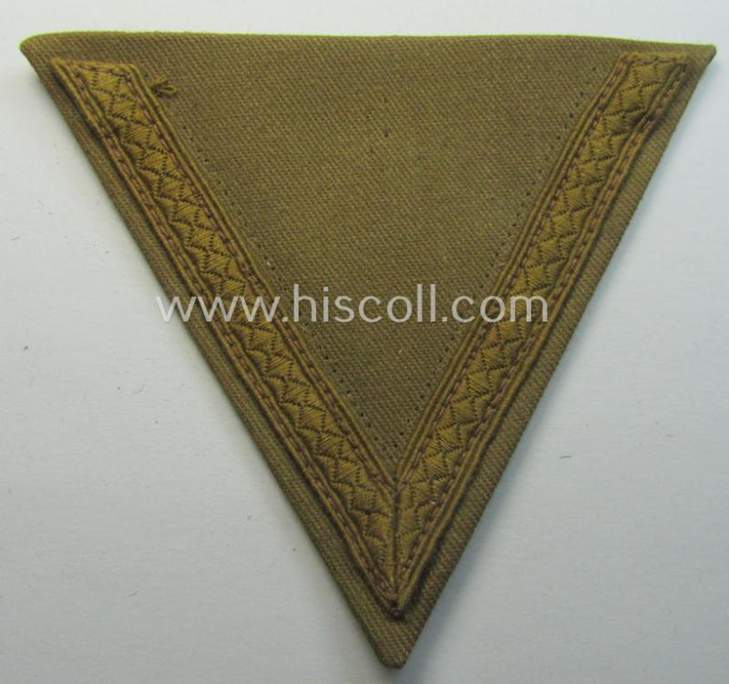 This is an attractive - and I deem simply never used nor worn! - example of a WH (Heeres), typical tropical-issue 'Armwinkel' (ie.: arm-chevron) as was executed on a typical, reed-green-coloured- (and/or somewhat thicker-styled) background as was intended for usage by a soldier with the rank of: 'Gefreiter' (ie. private first-class) and that comes in an overall very nice- (and I deem 'virtually mint- ie. unissued'-), condition. The chevron is neatly executed and shows a single stripe of golden-yellow-coloured- (ie. truly 'sub-dued') and/or 'standard'-tropical-pattern NCO-braid (as can be seen on the pictures). The piece shows an unusually seen, buckram-based backing (as can be seen on the pictures). It sounds maybe strange but these 'simple', tropical-styled Heeres-related rank-insignia are quite hard to encounter. Simply an attractive tropical WH-rank-badge that is I deem accordingly priced!