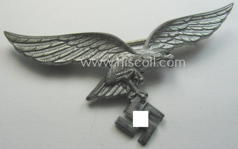 This is an attractive - and truly not that often encountered! - WH (Luftwaffe) zinc- (ie. 'Feinzink'-) based breast-eagle as was specifically intended for usage on the white summer-tunics (ie. 'Brustadler für Sommerrock') being a detailed- albeit (typically) non-maker-marked specimen that comes in an overall nice- (and I deem just moderately used- and/or worn-), condition. The eagle is - as stated above - a very detailed example (of the second pattern) that is constructed of fairly shiny, zinc- (ie. 'Feinzink'-) based metal. The eagle - which has naturally a functional and/or non-altered pin and/or catch(set-up) - has - as stated above - great pronounced detail and was never cleaned nor polished: it is still a tiny bit dirty ie. stained (as can be seen on the pictures). As possibly known are also these breast-eagles regrettably copied (most times being the aluminium ones which are clearly stamped 'A' in the centre on the back): this one is as stated above of course a 100% garuanteed original example that originates from a private-household and that was never before part of any collection. Simply a very decorative - and not that commonly observed! - summer-type, zinc- (ie. 'Feinzink'-) based LW breast-eagle!