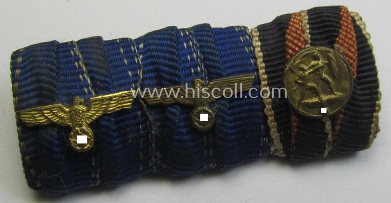 This is an attractive - and unusually seen! - 3-pieced, WWII-period ribbon-bar (ie. 'Feld- o. Bandspange') showing respectively the ribbons for two (WWII- ie. TR-period-) so-called: 'WH-Dienstauszeichnungen der 3. u. 4. Klasse' (or WH loyal-service medals as awarded for four- ie. twelve years of loyal service both having a (golden- ie. silver-coloured-) eagle-device attached and a: 'Medaille zur Erinnerung an den 1. Oktober 1938' (or: Czech 'Anschluss'-medal) as was awarded to all members of the armed forces that participated in the German occupation of Czechoslovakia that started on: '1. Oktober 1938' and that comes with a firmly attached miniature medal attached, all three ribbons (and 'Auflage') coming in a wonderful- (and only moderately used- ie. worn-), condition. The ribbons are of the regular (ie. smaller), ribbon-bar-size and measure approximately 1 cms. each (as is more often encountered). The 'Spange' comes in a very nice condition overall and is not 'backed' with a piece of wool but comes mounted onto a chromed-metal 'backing-plate' (as more often). The attached (and very detailed!) devices shows some minimal age ie. tarnish but have been nicely preserved. Of additional interest is, moreover, the fact that this example was confectioned in the so-called: 'Austrian manner. ' This particular example was in my opinion only moderately worn ie. used: it does show some usage-marks and/or minimal aging ie. wear. Simply an attractive 'Feld- o. Bandspange' having an desirable combination: great to decorate almost any WWII-tunic!
