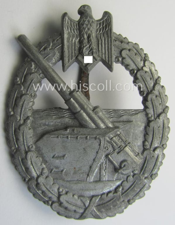 WH (Kriegsmarine) 'Marine-Artillerie-Abzeichen' being a clearly maker- (ie. 'L/56'- thus by: 'Funcke & Brüninghaus'-) marked and/or zinc- (ie. 'Feinzink'-) based example