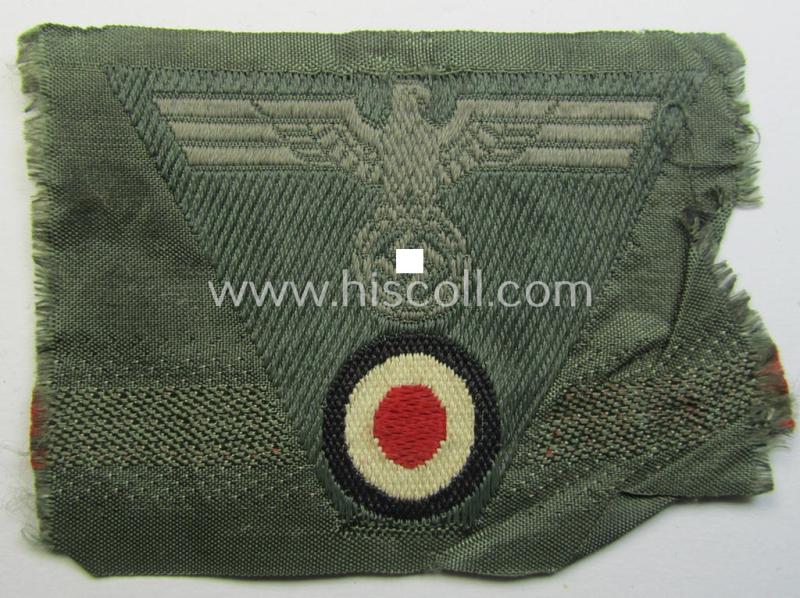 This is a neat - and I deem never simply used nor once cap-attached - example of the 'standard-issue'-type, WH (Heeres) so-called: 'M43-pattern'-cap-eagle/cocarde (ie. cap-trapezoid) as was specifically produced for usage on the so-called: 'M-43'-model field-caps (ie. 'Einheitsfeldmützen') and that comes in an overall nicely preserved condition. The piece is executed in the so-called: 'BeVo'-weave-pattern and was never confectioned nor pre-folded and comes as recently found. The piece - that originated from a small cloth insignia-lot that was originated from the USA where it was brought as a so-called: 'veteran bring-back'-item - is executed in bluish-grey-coloured linnen on a field-grey-coloured (and/or also linnen-based) background and does show some minimal age and/or staining ie. storage-age: it was once glued into an album or alike and still shows some glue- ie. paper-remains on it back (as can be seen on the pictures). Simply a neat occasion to aquire an attractive, 'BeVo'-woven cap-trapezoid for a competitive price!