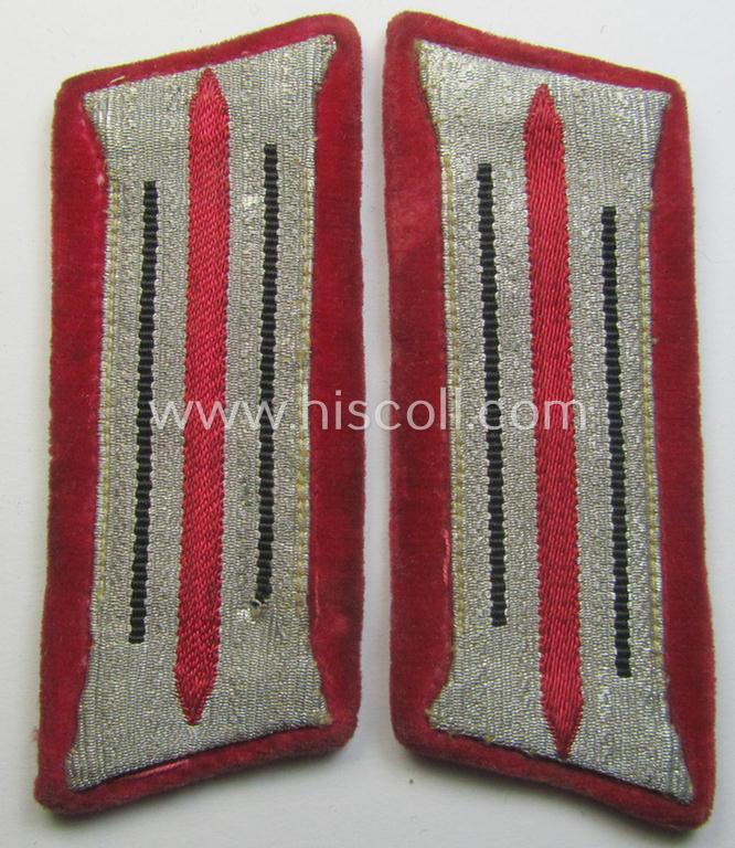The neat - and/or fully matching! - pair of 'Feuerwehr' (ie. fire-brigade) I deem mid- (ie. later-) war-period- and/or: 'standard-issued'-pattern collar-tabs (or: 'Einheitskragenspiegel für Mannschaften u. Unterführer der Feuerwehr') come mounted onto their (pinkish-red-coloured- and/or velvet-based) 'backings' and are piped in the typical, black-coloured (ie. 'generic'-style) branchcolour having a pinkish-red-coloured 'centre-stripe' and were as such intended for usage by all personel (ie. NCOs) within all 'Feuerwehr'-related branches of the: 'Deutsche Wehrmacht' troughout the war. The tabs come in an overall nice condition and were (I deem) used- ie. once tunic-attached (as can be seen on the pictures). Both tabs show some minimal glue-remains on their backs, simply caused by having been glued into an album or scrapbook once (as can be seen on the pictures). The tabs - that originated from a small cloth insignia-lot that originated from the USA where it was brought as a so-called: 'veteran bring-back'-item - does show some minimal age and/or staining ie. storage-age (as can be seen on the pictures).Simply a great pair to complete any WWII-period, fire-brigade-tunic or to be simply stored in any insignia-collection!