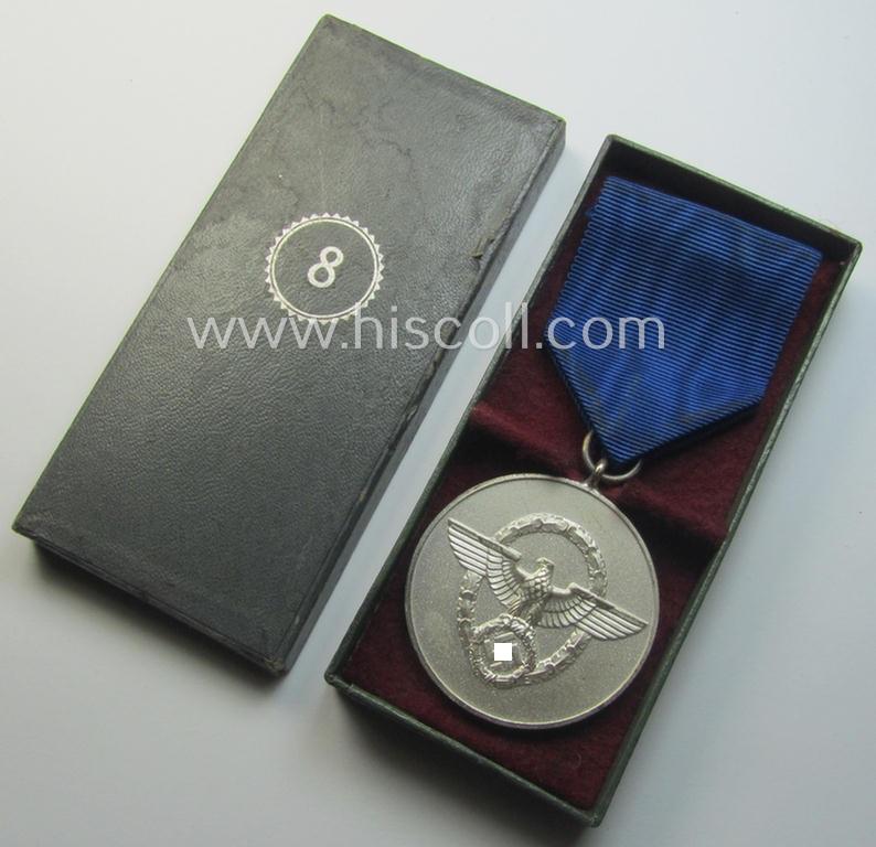 This is an attractive example of a silver-class: 'Polizei-Dienstauszeichnung 3. Stufe' (or: police loyal-service medal third class as was awarded for 8 years of loyal service within the various TR-police-services) and that comes mounted onto its (confectioned) period ribbon (ie. 'Bandabschnitt') and that came stored in its original (2-pieced) etui and that comes in an overall very nice- (and I deem only minimally used- ie. worn-), condition. The medal truly retains pronounced details and is just minimally darkened ie. tarnished by age: it retains a fair bit of its 'off-factory' polished-sides (ie. 'hochpolierte Kanten'). The medal retains a great age patina overall (it has possible once been cleaned ie. polished). The award came naturally mounted onto its original, confectioned- (ie. approximately 9 cms. long- and/or: 3,7 cms. wide-sized-) cornflower-blue-coloured ribbon that still retains its copper-toned 'clip' (mounted for easily wearing the piece on a tunic). The scarcely found, typical (darker) greenish-coloured (and carton-based-) 2-pieced etui comes in an overall nicely preserved - albeit clearly issued - condition. It shows a silver-toned (and fully undamaged) 'circle' with the number '8' (as can be seen on the pictures). The etui is totally undamaged but does show some minimal wear, age and/or staining (as can be seen on the pictures). Simply a very nicely preserved - and/or complete! - 8-yrs. police loyal-service-medal-set!