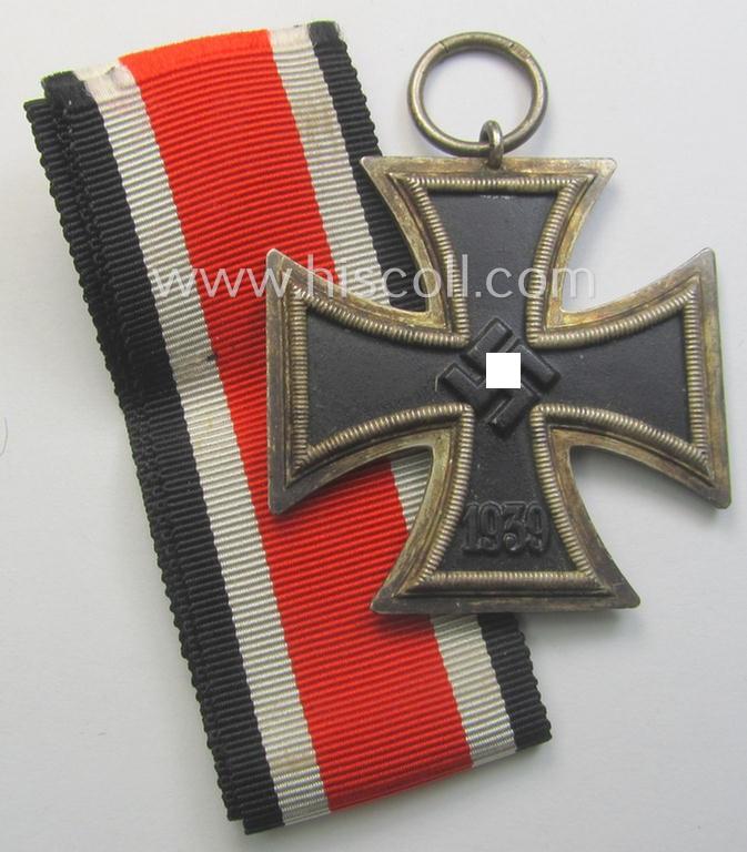 This is an attractive - untouched and I deem hardly used nor once-mounted! - example of an: 'Eisernes Kreuz 2. Klasse' (ie. Iron Cross 2nd Class) being a clearly maker- (ie. '123'-) marked example as was produced by the: 'Beck, Hassinger & Co.'-company as was based in the town of Strasbourg and that comes in an overall very nice- (and I deem issued- albeit simply never worn- nor once-mounted-), condition. The piece on offer here has most certainly never been cleaned and shows a very attractive (blackened- and truly 'satin-like'- ie. somewhat matted-) patina and shows a fully undamaged, black-coloured 'inner-core'-section. The piece - which shows a clear makers'-designation '123' stamped into its ring and that can as such be attributed to the 'Beck, Hassinger & Co.'-company (ie. 'Hersteller 123') - is just a bit tarnished by age and has lost its polished sides (or: 'hochpolierte Kanten') and does just show some minimal storage-age only. It came together with its non-confectioned- and full length (ie. approx. 29 cms. long-sized-) ribbon (ie. 'Bandabschitt') as issued,and/or stored for decades. As stated above has the cross great and very fine detail: it has just a bit 'tarnished' over the years. Simply a neat - and fully untouched! - IC 2nd. class by the 'Beck, Hassinger & Co.'-company that is - I deem - accordingly priced!