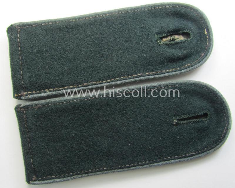 This is an attractive - fully matching and actually not that easily found! - pair of 'standard-issued'- (ie. non-privately-purchased nor 'tailor-made'-) pattern, WH (Heeres) early-war period- (ie. 'M36'- ie. 'M40'-pattern and/or: rounded-styled) NCO-type shoulderstraps (ie. 'Schulterstücke für Mannschaften des Heeres') as was piped in the desirable light-blue- (ie. 'kornblumenblauer'-) coloured branchcolour as was specifically intended for usage by a: 'Soldat eines Nachschub Kraftfahr-Abteilungs' (or: simple soldier ie. truck-driver who served within an army transport-unit) and that comes in an overall nice- (ie. just moderately used- ie. worn-), condition. The neat straps - which have the 'standard'-pattern, darker-green-coloured- and/or typical 'smooth woolen'-based 'upperdecks' and that measure approximately 11,9 cms. in length each - show the neat light-blue- (ie. 'kornblumenblauer'-) coloured and/or woolen-type piping attached (as can be seen on the pictures). The straps come naturally mounted onto their period tongues and come both in an overall nice- and/or just moderately used- and/or worn condition (as can be seen on the pictures). Simply an excellent occasion to acquire a neat EM-type, 'Nachschub'-related shoulderstrap-pair for an I deem justified price!