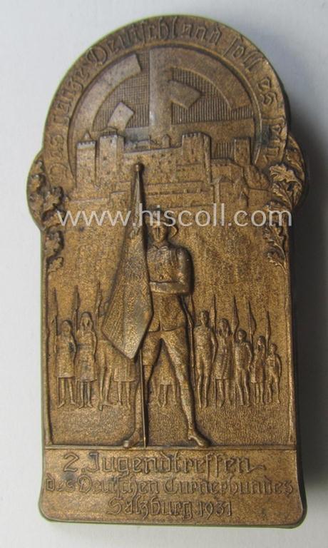 Unusual, 'Deutscher Turnerbund'-related 'tinnie' being a maker- (ie. 'P. Koppenwall'-) marked example depicting a stylished DT-device ie. logo, flag-bearer and text: '2. Jugendtreffen des deutschen Turnerbundes - Salzburg - 1931'