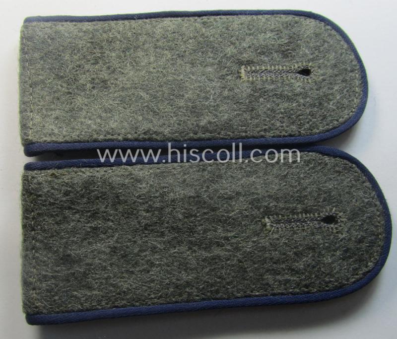 This is a very attractive - fully matching and with certainty truly rarely found! - WH (Heeres) ie. 'Santitäter'-related and early-war-period, 'M40'- (ie. 'M41'-) pattern, enlisted-mens' shoulderstraps as piped in the darker-blue- (ie. 'blauer'-) coloured branchcolour as was specifically intended for - and just moderately used by! - a simple soldier (ie. 'Soldat' ie. 'Sanitäter' or medical-orderly) who served within an army: 'Sanitäts-Abteilung' and that comes in an overall very nice- (albeit minimally used ie. worn- and/or most certainly once tunic-attached-), condition. The straps are just moderately worn and do show some minimal wear, age and/or staining but are void of any damage or alike (as can be seen on the pictures). The straps show the desirable darker-blue- (ie. 'blauer'-) coloured - and/or desirable 'silk-like'-type piping attached and measure approximately 11 cms. in length each. The pieces came mounted onto their period tongues attached and is constructed from the typical field-grey-coloured wool and is with certainty a 'standard-issued'-pair. These type of shoulderstraps are of the fairly early-war-period-pattern straps and were worn in the period around 1940/1941 (and were 'worn-out' even during the rest of the war). This particular pair originated from a larger cloth- ie. 'cyphered'-shoulderstrap-collection I recently acquired for the web-site. Simply a very attractive - and with certainty very desirable! - 'Sanitäter'-related EM-type shoulderstrap-pair that belonged to a: 'Soldat eines Sanitäts-Abteilungs'. I deem that I have priced this truly very attractive - and rarely encountered! - EM-type pair according to its desirabilty and overall very nicely preserved condition!