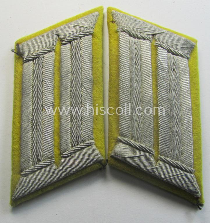 This is an attractive - and just moderately used- and carefully tunic-removed - pair of neatly hand-embroidered and fully matching, WH (Heeres) officers'-type, so-called: 'Waffenrock'- (ie. dress-) collar-tabs (ie. 'Kragenspiegel für Waffenrock') as piped in the (scarcely seen!) bright-yellow- (ie. 'zitronengelber'-) coloured branchcolour as was specifically intended for usage by an: 'Offizier eines Nachrichten-Abteilungs- o. Regiments' (or: officer who served within an army signals-unit) and that comes in an overall nice- (ie. clearly used- and/or once-tunic-attached-), condition. The pair - which is of the specific pattern that was used on the WH-dress-tunics or: 'Waffenröcke' - is piped in the neat bright-yellow- (ie. 'zitronengelber'-) coloured branchcolour as was once tunic-attached (by means of hand-stitching). The pieces are fully identical in execution and are nicely 'backed' with 'buckram'-based material as to be expected (as can be seen on the pictures). The pair shows extraordinary hand-embroidery and is fully void of any corrosion but does show some (minimal) age, wear and/or staining. In any case is this a very attractive, 'Heeres-Nachrichten'-related officers'-type 'Waffenrock'-insignia-set as was intended for usage by an: 'Offizier eines Nachrichten-Abteilungs- o. Regiments': iit will be hard to upgrade this attractive and truly used pair!