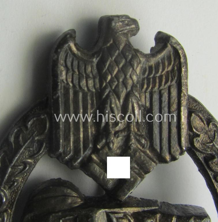 This is an attractive - albeit clearly ie. moderately used- ie. worn! - example of a: 'Panzerkampfabzeichen in Silber' (or: silver-class panzer-assault badge or PAB) being a non-maker-marked- and/or typical zinc- (ie. 'Feinzink'-) based example that comes in an overall nice- (albeit moderately used- ie. worn-), condition. The attractive badge on offer here concerns a somewhat early-war-period (and hollow-back!) typical zinc- ie. 'Feinzink'-based specimen that retains a fair bit of its (somewhat tarnished) silver-toned finish (as can be seen on the pictures). The badge has - I deem - never been cleaned nor polished (and is still also a tiny bit dirty ie. stained- ie. tarnished as mentioned above). As stated above, is the piece a non-maker-marked example that shows various characteristics - such as for example the typical-shaped, square-sized 'pin-mounting' and/or catch-set-up - typically seen with PABs as produced by the: 'Wilhelm Deumer-company based in the town of Lüdenscheid: it deals (I deem) with a so-called: 'hollow zinc “early”-pattern' (as is uniquely numbered with the reference-number: '2.1.2.' according to the excellent reference-work entitled: 'The Panzer-Assault badge of WWII' by my Belgian friend Philippe de Bock). The neat piece - which is very pronounced and has maintained great detail - naturally shows all the details as to be expected for a badge by this particular maker. It was found as such at a German private-household and was never before in a collection. Simply an attractive and honest, silver-class PAB that comes in an overall nice albeit moderately used- ie. worn, condition!