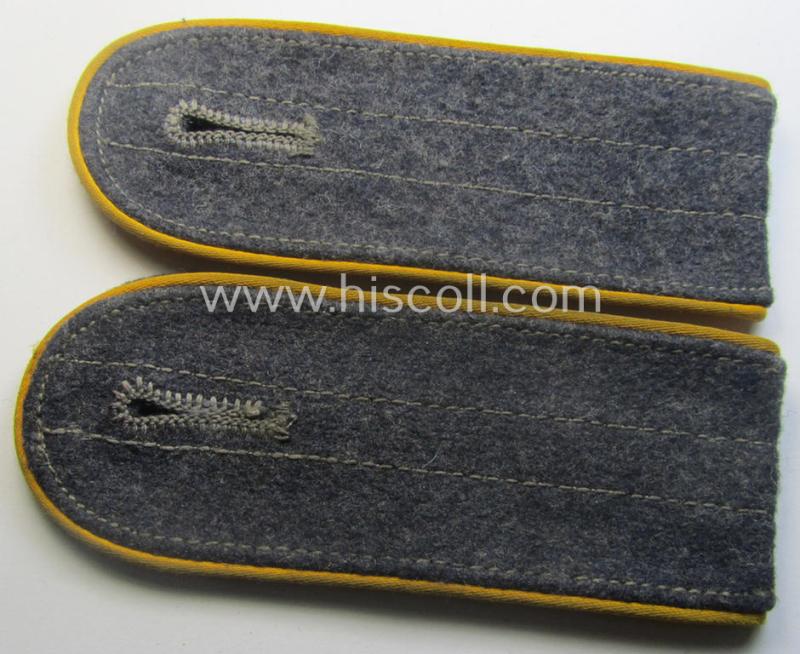 This is a very attractive - fully matching and actually scarcely encountered! - pair of later-war-period, so-called: 'M44'-pattern, 'simplified' WH (Heeres) enlisted-mens'-type shoulderstraps as piped in the golden-yellow- (ie. 'goldgelbener'-) coloured branchcolour as was specifically intended for usage by a: 'Soldat der Flieger o. Fallschirm-Truppen' (or: simple soldier who served within the pilots'- or paratroopers' branch) and that comes in an overall very nice- (ie. I deem hardly used nor worn- ie. 'virtually mint'), condition. The neat shoulderstraps - which measure approximately 11,5 cms. in length each as more often seen - have the neat, golden-yellow- (ie. 'goldgelbener'-) coloured and/or 'silk-like'-type piping attached (as is more encountered with these later-war-period shoulderstraps). The shoulderstraps are constructed following the typical '1944 cloth-minimising production-manner', using different shades of wool and/or material (as can be seen on the pictures). The straps come naturally mounted onto their functional tongues. It should be noted that all 'M44'-pattern, Luftwaffe EM-type straps are actually quite hard to find and can easily be graded 'scarce': even more so when they are piped in the desirable, golden-yellow- (ie. 'goldgelbener'-) coloured branchcolour. Simply an attractive - and/or fully 'text-book', M44-pattern EM-type 'Flieger o. Fallschirm-Truppen'-pair that was intended for usage by a: 'Soldat der Flieger o. Fallschirm-Truppen'!