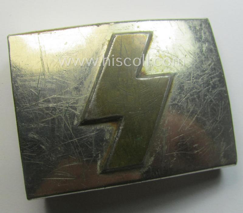 The attractive - and actually nowadays not that easily found! - youth-related belt-buckle (ie. 'Koppelschloss') is just moderately used and/or worn and retains most of its quite shiny, silverish- and/or typical 'nickle-chromed'-finish (it has, however, - I deem - never been cleaned nor polished and only shows some dust and/or staining as to be expected). This specimen shows a clearly present makers'-designation stamped into its back that simply reads: 'RzM M4/46' (something that is more often but most certainly not always encountered!). The buckle shows a copper-toned- (and typical early-period) regular-shaped, so-called: 'DJ-Rune'-sign that shows some minimal scratches on its front (as can be seen on the pictures). The piece orginates from an older belt-buckle-collection that was compiled over many years and that I acquired for the web-site. I deem that I have priced this neat youth-related belt-buckle according to its untouched and just moderately used and/or worn, condition!