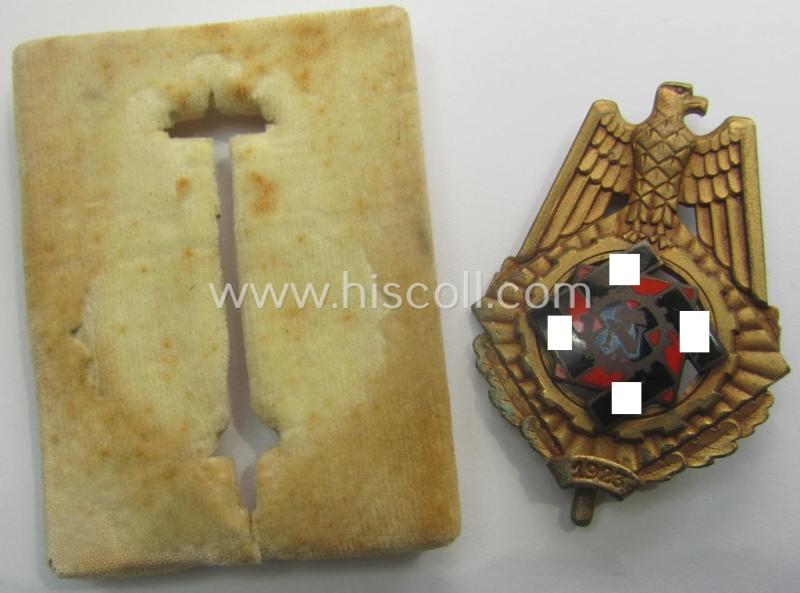 This is a truly superb - and actually rarely encountered! - so-called: 'Technische Nothilfe' (ie. 'TeNo') honorary-award (ie. 'Ehrenzeichen mit Jahreszahl 1923') being a maker- (ie. 'Wilh. Fühner'-) marked and/or: serial-numbered (ie. '2025'-marked-) example that comes stored in its accompanying etui-inlay as issued and/or stored for decades. The very attractive and neatly multi-coloured award (that is executed in golden-bronze-toned so-called: 'Buntmetall') has a fully preserved enamelled surface (that is totally void of any enamel-damage or alike as can be seen on the pictures). It comes mounted on its functonal (and totally unaltered!) pin- ie. pin-/catch set-up. The pin shows a clearly present makers'-mark that reads: 'Wilhelm Fühner - Pforzheim' (being the only producer of these rarely observed awards). The back of the badge shows an engraved serial- ie. bearers'-number (that reads: '2025'). The award came stored in its period (beige-coloured- and carton- ie. velvet-based-) etui-inlay (ie. interior-section) that shows some evident usage. The accompanying etui is regrettably missing. Simply in all respects a very attractive TeNo-award-set. It should, moreover, be noted that I have seen these rarely seen: 'Ehrenzeichen mit Jahreszahl 1923'-sets sell for much more than my asking-price!