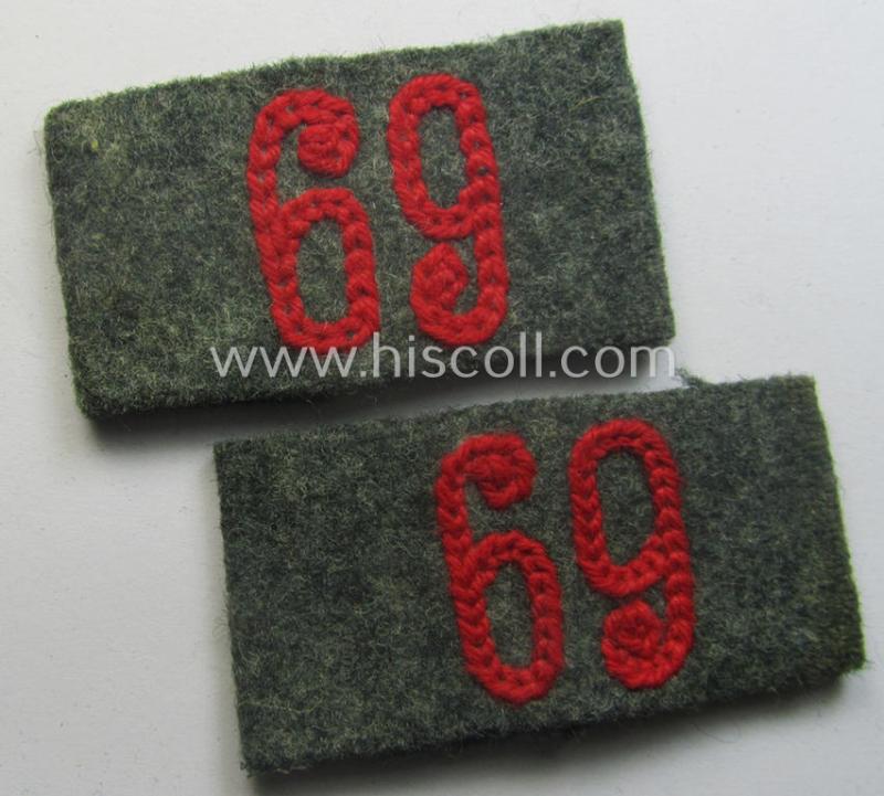 This is an attractive - truly matching and/or fully identical! - pair of WH (Heeres) 'Artillerie'-related, so-called: regimental shoulderstrap-'slip-ons' (ie. 'Schulterstück-Überschuben') as was specifically intended for usage by a: 'Soldat des Artillerie-Regiments 69' and that comes in an overall very nice- (and I deem hardly worn- nor used- ie. still 'virtually mint'-), condition. The pair is neatly 'machine-stitched'-embroidered in the typical bright-red- (ie. 'hochroter'-) coloured wool by means of so-called: 'Kurbelstickerei' as to be expected. Simply a nice opportunity to aquire an attractive pair of 'Artillerie'-related 'Überschuben' that is - I deem - accordingly priced: great to 'decorate' a pair of 'roter'-piped 'Heeres'-shoulderstraps or ideally fitted to keep in any insignia-collection!
