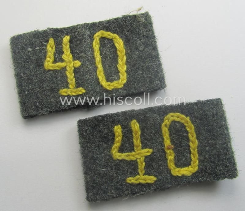 This is an attractive - truly matching and/or fully identical! - pair of WH (Heeres) 'Nachrichten'-related, so-called: regimental shoulderstrap-'slip-ons' (ie. 'Schulterstück-Überschuben') as was specifically intended for usage by a: 'Soldat des Nachrichten-Abteilungs 40' and that comes in an overall very nice- (and I deem simply never worn- nor used- ie. still 'virtually mint unissued'-), condition. The pair is neatly 'machine-stitched'-embroidered in the typical bright-yellow- (ie. 'zitronengelbener'-) coloured wool by means of so-called: 'Kurbelstickerei' as to be expected. Simply a nice opportunity to aquire an attractive pair of 'Nachrichten'-related 'Überschuben' that is - I deem - accordingly priced: great to 'decorate' a pair of 'bright-yellow'-piped 'Heeres'-shoulderstraps or ideally fitted to keep in any insignia-collection!