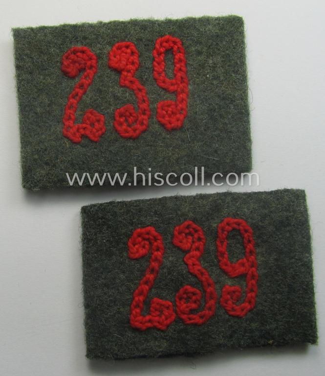 This is an attractive - truly matching and/or fully identical! - pair of WH (Heeres) 'Artillerie'-related, so-called: regimental shoulderstrap-'slip-ons' (ie. 'Schulterstück-Überschuben') as was specifically intended for usage by a: 'Soldat des Artillerie-Regiments 239' and that comes in an overall very nice- (and I deem hardly worn- nor used- ie. still 'virtually mint'-), condition. The pair is neatly 'machine-stitched'-embroidered in the typical bright-red- (ie. 'hochroter'-) coloured wool by means of so-called: 'Kurbelstickerei' as to be expected. Simply a nice opportunity to aquire an attractive pair of 'Artillerie'-related 'Überschuben' that is - I deem - accordingly priced: great to 'decorate' a pair of 'roter'-piped 'Heeres'-shoulderstraps or ideally fitted to keep in any insignia-collection!