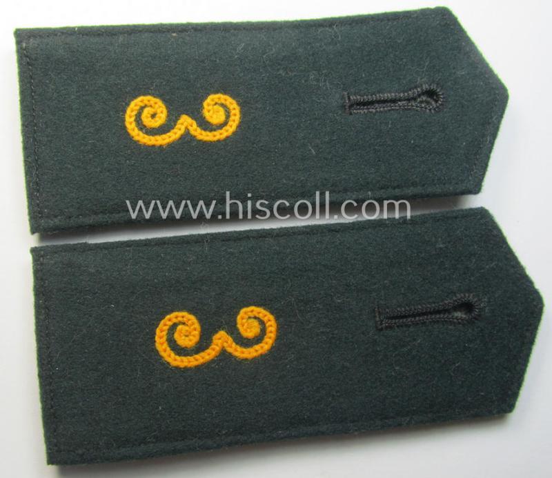 This is a truly attractive - fully matching and actually scarcely found! - pair of WH (Heeres), early- (ie. pre-) war-period, 'M36'-pattern (pointed-styled), 'cyphered' enlisted-mens'-type shoulderstraps (being a pair having no branchcolour ie. piping as per regulation) as was intended for usage by a: 'Soldat des Kavallerie- o. Reiter-Regiments 3' (or: simple soldier who served within the cavalry regiment, numbered: '3') and that comes in overall very nice- (albeit minimally used- and/or worn-), condition. The neat straps - which are both approximately 11cms. sized in length - have the 'standard-pattern' and/or: darker-green-coloured- (and woolen-based) 'upperdecks' and have as stated above no piping nor branchcolour attached: they are of the 'generic pattern' (as can be seen on the pictures). The shoulderstraps show the neat, golden-yellow- (ie. 'goldgelbener'-) coloured and/or machine-embroidered: '3'-numerals ie. 'Ziffern' (which are executed in so-called: 'Kurbelstickerei' as to be expected). The pair comes naturally mounted onto its original tongues and does just show some minimal age-, wear and/or staining (as can be seen on the pictures). Simply a neat - and I deem quite early- (ie. pre- or early-war-) period - 'Heeres' EM-type, shoulderstrap-pair that belonged to a: 'Soldat des Kavallerie- o. Reiter-Regiments 3': I deem that I have priced this attractive - and surely desirable! - Heeres-pair, accordingly!