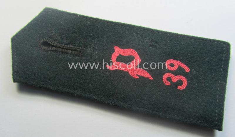 This is a truly attractive - albeit regrettably single but nevertheless rarely found! - example of an early-period (ie. 'M36 o. M40'-pattern and/or pointed-styled and as per regulation non-piped) WH (Heeres) 'cyphered', enlisted-mens'-type shoulderstrap as was specifically intended for usage by a: 'Soldat u. Mitglied des Panzerjäger-Regiments 39' (or: simple anti-tank- ie. tank-destroyer-soldier who served within the anti-tank-regiment, numbered: '39') and that comes in an overall very nice- (ie. just moderately used- ie. worn-), condition. The neat strap - which is executed in the darker-green-coloured wool - is void of any piping and is of the generic-pattern as to be expected. The strap measures approximately 11 cms. in length and comes mounted onto its original tongue. It shows the neat (machine-embroidered by means of so-called: 'Kurbelstickerei'), Gothic-styled: 'P'-cypher and/or: '3'- and '9'-numerals (or: 'Ziffern') attached (which are executed in the bright-pink- ie. 'rosatoter'-coloured wool ie. linnen as to be expected). The strap - which is of the typical 'standard-issued'-pattern - shows as stated above only moderate usage and wear (just some minimal age, dust and/or staining is visible and/or present). It should be noted that ALL 'cyphered', enlisted-mens'-pattern, 'Panzerjäger'-type shoulderstraps can easily be regarded 'rare' and come not often for sale. In any case a very attractive and early-war-period, 'Heeres-Panzerjäger'-related, EM-type shoulderstrap that was intended for usage by a: 'Soldat u. Mitglied des Panzerjäger-Regiments 39': too bad that it is only a single specimen!
