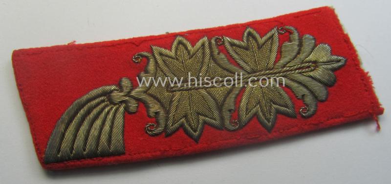 This is a truly very attractive - albeit regrettably single! - WH (Heeres), neatly hand-embroidered, general-officers'-pattern collar-patch (ie. 'Kragenspiegel für Generale des Heeres') as was specifically intended for an army general-officer and that comes in an overall very nice- (I deem clearly issued-, worn- and/or carefully tunic-removed-), condition. The neat tab - which are executed in typical, bright golden-toned 'braid' - has the bright-red-coloured- and truly smooth-woolen- (ie. 'moleskin'-) based 'background' (as can be seen on the pictures). The tab shows truly extraordinary detail and is by all means a great example of the employed craftmenship of the days. The tab is just a tiny bit tarnished- ie. stained (simply caused by years of storage and/or moderate wear) and still shows some its period stitching-remains with which it was once tunic-attached. The tab belonged to an army 'General' who kept and/or stored this neat insignia-piece for decades. Simply a very attractive and/or truly detailed WH (Heeres) general-officers'-type collar-tab that is priced according to its unmistaken rarity and/or desirability!