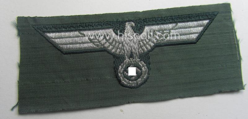 This is an attractive - and simply never used- nor cap-attached and actually not that easily encountered! - WH (Heeres) 'flatwire'-woven, officers'-type overseas cap-eagle (ie. 'Offiziersadler für Schiffchen') as was also intended for usage on the: 'Knautschmützen o. Alter-Art-Schirmmützen' ie. visor-caps and that comes in an overall very nice- (ie. simply never used- ie. 'virtually mint'-), condition. These desirable cap-eagles were intended for usage on the popular so-called: 'Knautschmützen' ie. 'Alter-art' visor-caps but saw also usage on the 'high-quality' officers'-type 'Schiffchen' (ie. side-caps). The eagle is executed in bright-silver-grey- ('flatwire'-type) thread on a field-grey-coloured background and comes in a non-used condition: it comes 'as straightly cut-of-the role' (as can be seen on the pictures). It should be noted that these attractive 'flatwire-woven'-type cap-eagles are seldomly offered for sale and can as such easily be graded 'fairly scarce'. Simply a great occasion to acquire an attractive piece of German cap-insignia for a competitive price!