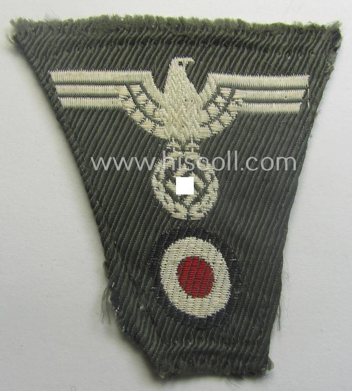 'Foreign-produced' (!) WH (Heeres) related, so-called: 'M43-pattern'-cap-trapezoid (ie. 'Mützentrapez') as executed in machine-woven- (ie. BeVo-like-) pattern onto a typical greenish-/field-grey-coloured- and/or linnen-based background