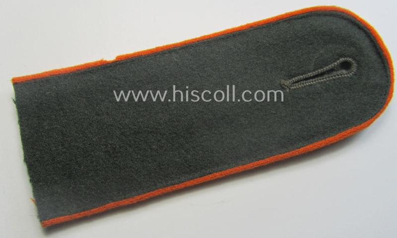 This is an attractive - albeit regrettably single but nevertheless not that often encountered! - early- (ie. pre-war-) period- (ie. 'M36'-pattern- and/or rounded-styled-) WH (Heeres) enlisted-mens'-type shoulderstrap having the bright-orange- ('orangeroter'-) coloured branchcolour as was intended for - and most certainly worn by! - a: 'Soldat einer Wehr-Ersatzdienstelle' (or: 'Feldgendarmerie'-unit) (or: simple soldier who was part of the recruitment-troops or evt. field-police unit) and that comes in overall very nice- (albeit issued ie. moderately worn-), condition. The shoulderstrap - which does show some regular age ie. wear and/or minimal staining caused by moderate usage - comes in an overall nice, albeit moderately used- and/or worn condition but is void of any damage whatsoever. The strap is executed in the darker-green-coloured- (and/or: 'smooth'-type) wool and has the woolen-based- and bright-orange- ('orangeroter'-) coloured piping attached. The neat shoulderstrap - which never had a tongue attached and that was which certainty intended to be worn as a piece of the 'sew-in'-type - measures approximately 11,9 cms. in length denoting the soldiers' rank ie. function of: 'Soldat einer Wehr-Ersatzdienstelle o. Feldgendarmerie'. I deem that I have priced this neat, bright-orange-piped EM-shoulderstrap according to its evident desirability and/or comparative rarity!
