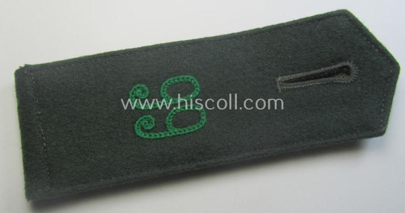 This is a very attractive - regrettably single but nevertheless actually truly scarcely found! - WH (Heeres) early-war-period, so-called: 'M36-/M40'-pattern- (pointed-styled) 'cyphered', enlisted-mens'-type (and as per regulation, non-piped!) shoulderstrap as was intended for - and clearly worn by! - a: 'Soldat des Gebirgsjäger-Regiments 99' (or: simple soldier who served within the army mountain-troops regiment, numbered: '99') and that comes in an overall very nice- (albeit moderately used ie. clearly worn-), condition. The shoulderstrap - which is approximately 13 cms. sized in length - has the 'standard-type'- and/or darker-green-coloured, smooth-woolen-based 'upperdeck' and shows the neat (machine-embroidered by means of so-called: 'Kurbelstickerei') double, so-called: '9'-cyphers ie. numerals (or: 'Ziffern'). Both 'cyphers' are executed in the darker-green- (ie. 'grüner'-) coloured wool ie. linnen as to be expected (as can be seen on the pictures). The strap - which came mounted onto its functional tongue - shows as stated above some moderate usage and/or wear (some minor staining and/or dust is visible and/or present). It should be noted that all 'cyphered'-pattern, WH (Heeres) shoulderstraps can easily be regarded 'fairly scarce'. This shoulderstrap originated from an older 'Gebirgjäger'-related shoulderstrap ie. board-collection that I recently acquired for the web-site. Simply an attractive and/or: early-war-period, neatly 'cyphered' and/or 'Heeres'-related EM-type shoulderstrap that was intended for usage by a: 'Soldat des Gebirgsjäger-Regiments 99': too bad that it is only a single specimen!