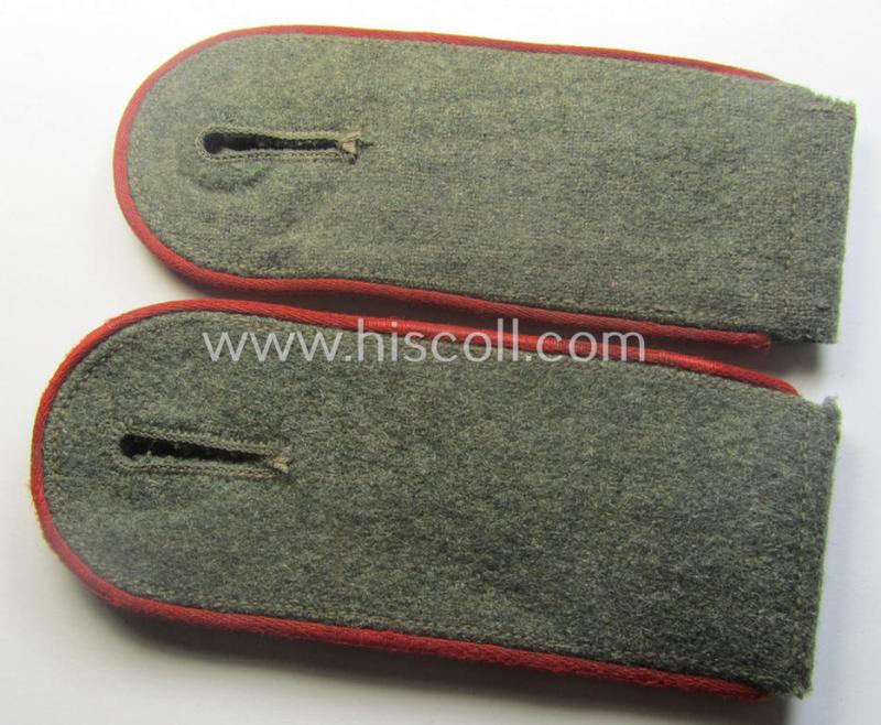 This is an attractive - just moderately used and/or fully matching! - pair of typical 'standard-issued'- (ie. non-'tailor-made'-) pattern, WH (Heeres) mid-war-period- (ie. 'M43'-pattern) enlisted-mens'-type shoulderstraps (ie. 'Schulterklappen für Mannschaften des Heeres') as was piped in the desirable bright-red- (ie. 'hochroter'-) coloured branchcolour as was specifically intended for usage by a: 'Soldat eines (Sturm)Artillerie-Abteilungs o. Regiments' (or: simple soldier who served within an artillery unit or regiment) and that comes in an overall very nice- (ie. I deem just moderately used- ie. worn-), condition. The neat straps - which have the 'standard'-pattern, field-grey-coloured and/or typical woolen-based 'upperdecks' and that measure approximately 11,5 cms. in length each - show the neat bright-red- (ie. 'hochroter'-) coloured and/or desirable silk-like-type piping attached (as can be seen on the pictures). The straps come naturally mounted onto their period (regular-shaped) tongues attached and come both in a very nice- (ie. fully 'text-book') condition overall (as can be seen on the pictures). The pair only shows moderate wear and/or age and is just very nicely preserved (as can be seen on the pictures). I deem this an excellent occasion to acquire a neat EM-type, non-privately-purchased '(Sturm)Artillerie'-related shoulderstrap-pair for a justified price!