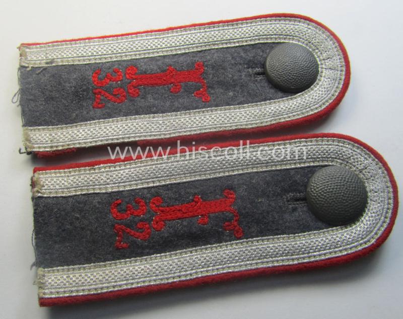 This is a truly attractive - fully matching and actually very scarcely seen! - pair of (I deem) pre-war-period and neatly 'cyphered', WH (Luftwaffe) NCO-type shoulderstraps as piped in the bright-red- (ie. 'hochroter'-) coloured branchcolour as was specifically intended for usage by an: 'Unterwachtmeister des Festungs-Flakartillerie-Abteilungs o. Regiments 32' (or: junior-sergeant who served within a specific fortress-anti-aircraft-unit, numbered: '32') and that comes in an overall nice- (ie. moderately worn- ie. clearly used- and/or carefully tunic-removed-), condition. The neat shoulderstraps - which measure approximately 11,8 cms. in length each - show the bright-red- (ie. 'hochroter'-) coloured branchcolour and have the woolen-type piping attached (as can be seen on the pictures). The straps that came without tongues were clearly used as a pair of the 'sew-in'-pattern (I deem that they were once attached to a so-called: 'Viertaschenrock'). They show - next to the 'standard'-pattern, silver-toned LW- ie. dotted-pattern NCO-braid - a pair of 'Gothic'-styled so-called: 'F'-cyphers (ie. 'Ziffern') and dito '3'- and/or '2'-numerals attached (which are executed in neat 'Kurbelstickerei' as to be expected) denoting that the pair was intended for usage by an: 'Unterwachtmeister des Festungs-Flakartillerie-Abteilungs o. Regiments 32'. The straps show some clear age, wear and/or staining and show some piping-damage on one of the straps (as can be noticed on the pictures). This pair - that came with a set of blue-coloured tunic-buttons attached -originated from a larger cloth- and insignia-collection that I recently acquired for the web-site: it should, moreover, be noted that all 'cyphered' LW-straps are truly very hard to find. Simply a great occasion to acquire an attractive - and rarely seen! - NCO-type, LW-shoulderstrap-pair that was intended for an: 'Unterwachtmeister des Festungs-Flakartillerie-Abteilungs o. Regiments 32'!