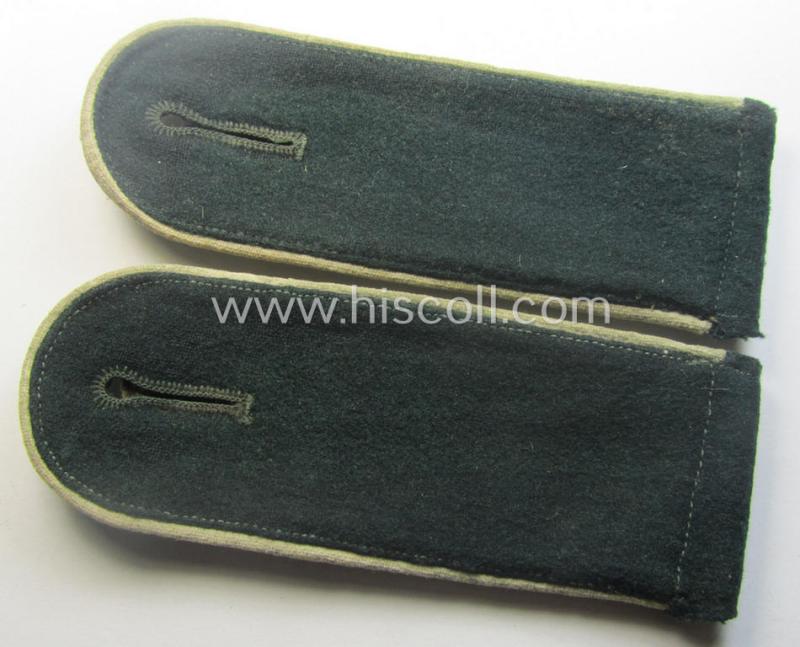 This is an attractive - fully matching and actually not that easily found! - pair of WH (Heeres), early- (ie. pre-) war-period (ie. 'M40'-pattern), 'standard-issued' (ie. NON-tailor-made!) enlisted-mens'-type shoulderstraps as piped in the neat white- (ie. 'weisser'-) coloured branchcolour as was intended for usage by a: 'Soldat der Infanterie-Truppen' (or: simple soldier who served within the infantry-troops) and that comes in overall nice- (albeit just moderately used- ie. worn-), condition. The neat straps - which are both approximately 12,2 cms. sized in length - have the 'standard-pattern', dark-green-coloured- and/or woolen-based 'upperdecks' and show the white- (ie. 'weisser'-) coloured- and/or desirable 'silk-like'-type piping attached (as can be seen on the pictures). The straps come naturally mounted onto their functional tongues and do both show some moderate age-, wear and/or minimal staining (as can be seen on the pictures). These type of shoulderstraps are of the fairly early-war-period pattern straps and were worn in the period around 1940 (and were 'worn-out' even during the rest of the war). This particular pair originated from a private-household in Germany and was most certainly always together and was worn as a pair. Simply a very attractive - and with certainty desirable! - 'Infanterie'-related EM-type shoulderstrap-pair: I deem that I priced this attractive pair according to its nice and fully untouched, condition!