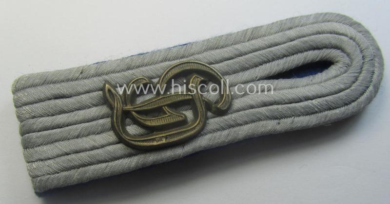 This is a very desirable - albeit regrettably single but nevertheless scarcely seen! - WH (Heeres) officers'-type, 'cyphered' shoulderboard as piped in the desirable darker-blue- (ie. 'blauer'-) coloured branchcolour (as constructed from the typical 'smooth-type' wool and that is showing a rarely observed, regular-sized and/or minimally tarnished, golden-toned 'GD'-cypher period-attached as was intended for usage by a: 'Leutnant u. Arzt der Sanitäts-Truppen' (ie. medical lieutnant and possibly doctor) who served within the famous 'GrossDeutschland'-division and that comes in an overall very nice- (albeit clearly used and/or carefully tunic-removed-), condition. The neat shoulderboard - which is piped in the darker-blue- (ie. 'blauer'-) coloured wool - is executed in the 'smooth-type'-wool and comes mounted onto its typical tongue attached. The board - which is approximately 10,4 cms. sized in length - has a greyish (ie. truly sub-dued) 'upperdeck' and shows the obvious signs of having been worn ie. having been once tunic-attached (it shows some minimal wear and/or usage). As stated above, does the board show a non-magnetic, regular-sized and/or (minimally tarnished) golden-toned, so-called: 'GD'-cypher period-attached denoting the officers'-rank of a: 'Leutnant' (ie. lieutnant). The 'cypher' retains both its prongs (as can be seen on the back of the board). This board originates from a larger cloth- and insignia-collection that I recently acquired for the web-site - was surely intended to be used onto a 'regular, front-used'-tunic. Simply a very attractive - and truly scarcely encountered! - neatly 'cyphered', officers'-type shoulderboard that shows lots of character and that belonged to a 'Sanitäts'-officer who served within a famous WH 'elite'-regiment: too bad that it is only a single specimen!